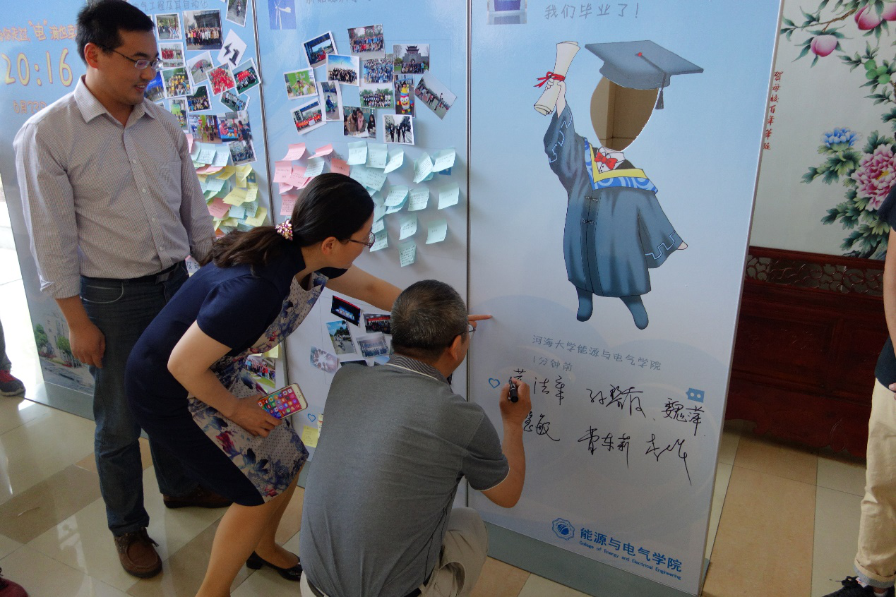 活动中,同学们在照片墙上粘贴班级或者自己最具代表性的珍贵照片,并且贴上了每位同学写下的祝福语。有的同学写下了对未来的期盼、有的表达了对母校的怀念、更多同学写下的是对老师和同学的祝福。汤鸣鸿副书记介绍了此次活动的内容和意义,袁越院长希望16届毕业生无论是工作还是升学,都要再接再厉,在未来努力成为一名能电院的优秀校友。魏萍书记祝福16届毕业生前程似锦,并希望大家毕业后能常回能电院看看。领导和老师们均在照片墙上签名点赞。活动最后,所有参与人员一起与照片墙合影留念。