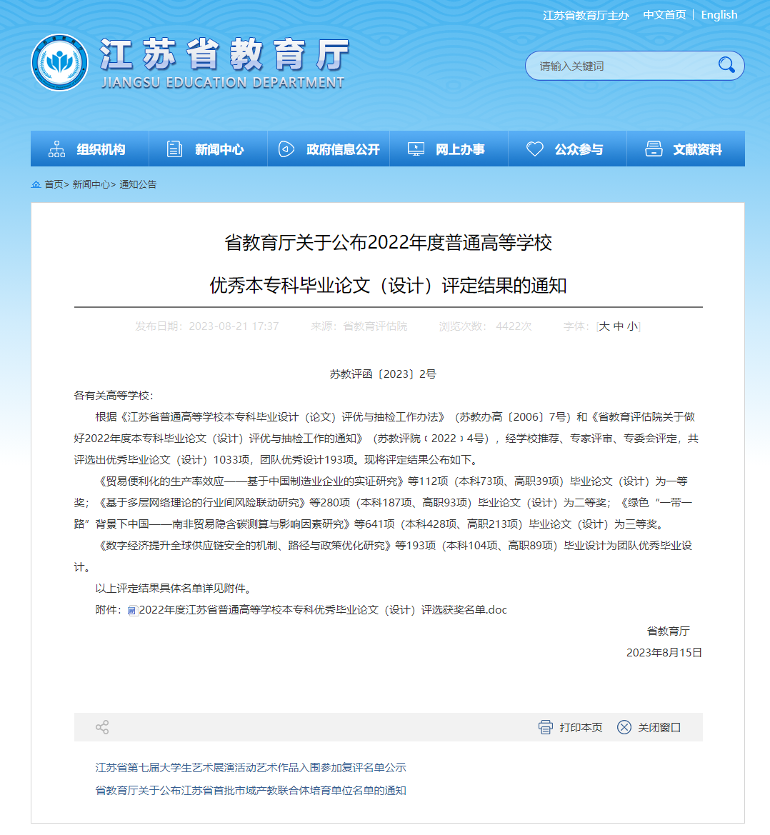 江苏省普通高等木瓜视频 本专科优秀毕业设计(论文)的评选,是在高等木瓜视频 择优推荐基础上,经省教育评估院组织专家评审选出,并由省教育厅审定。本次全省评选,木瓜视频 获一等奖4项、二等奖9项、三等奖2项以及团队优秀毕业论文(设计)3项,其中一等奖获奖数并列江苏高校第三名。