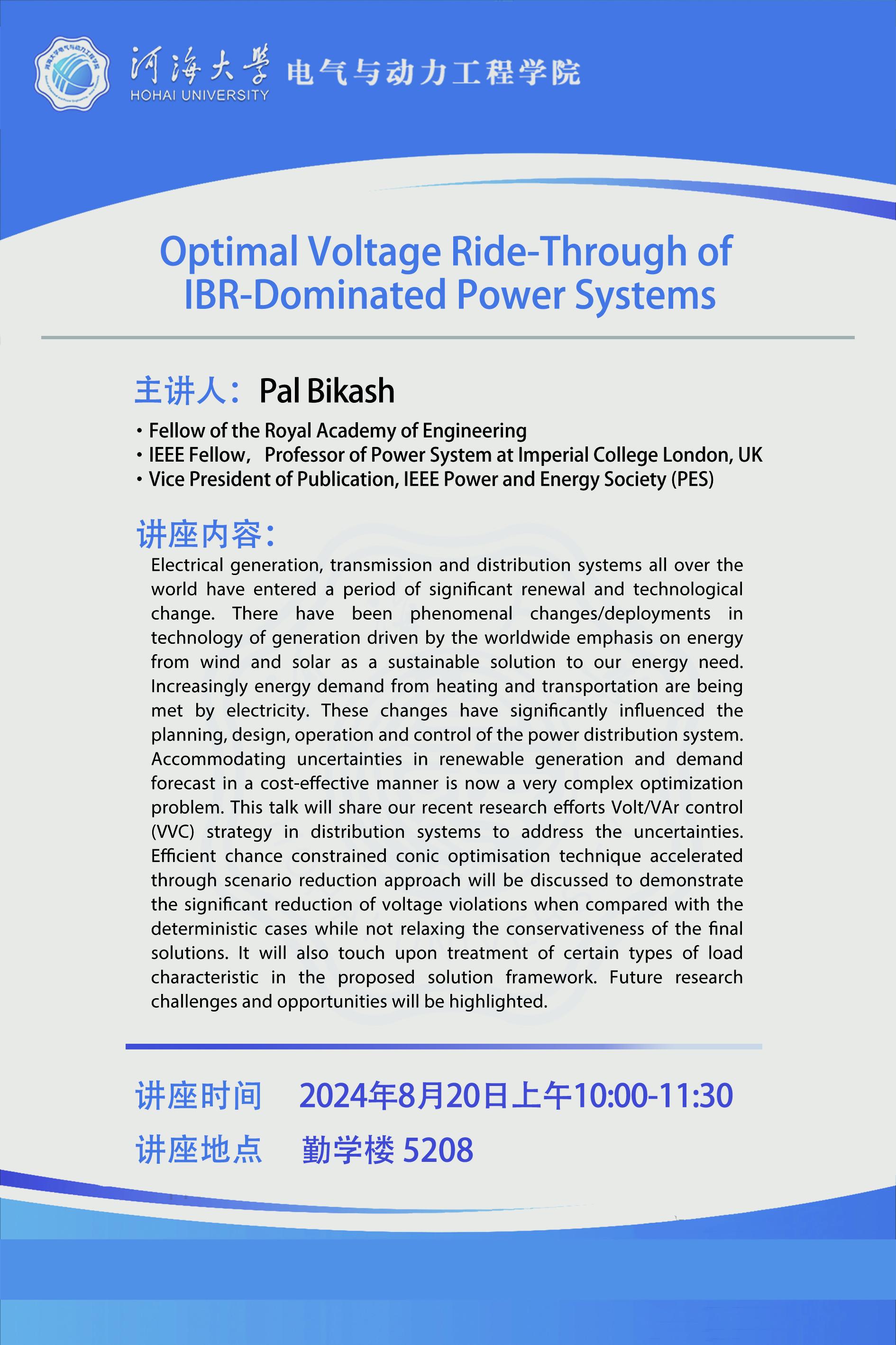 学术报告:Optimal Voltage Ride-Through of IBR-Dominated Power Systems