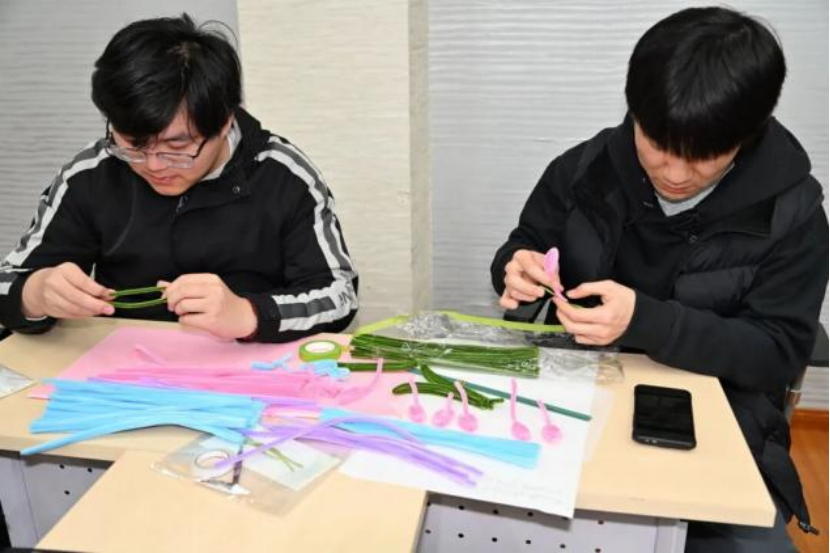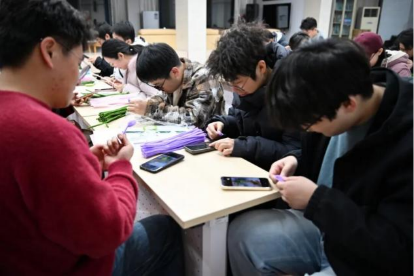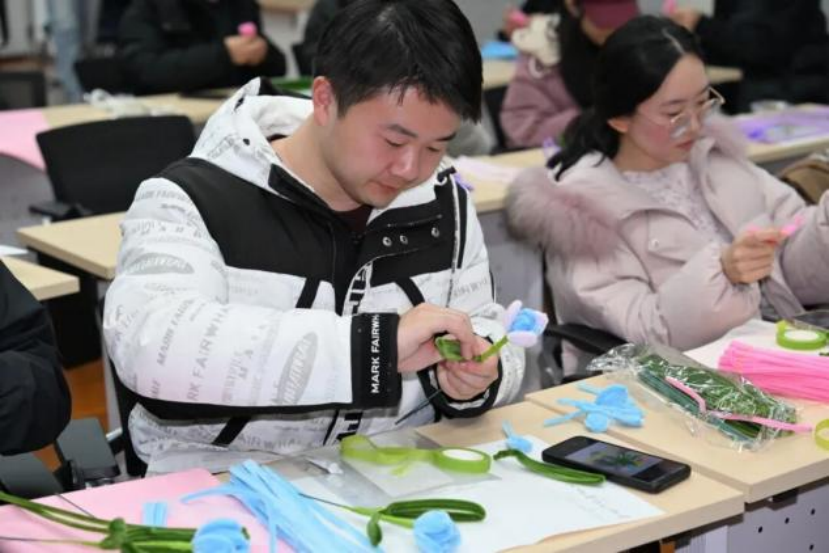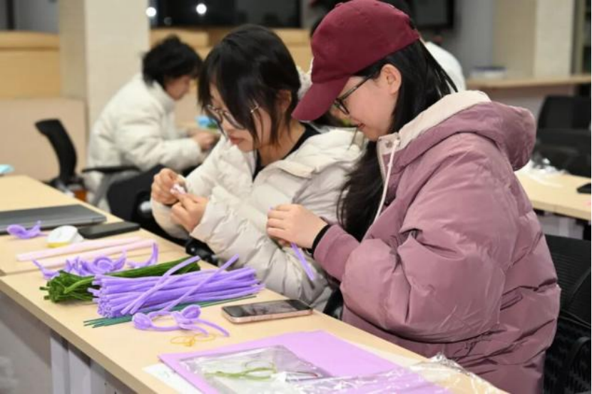 活动现场,同学们分组投入干花书签与扭扭棒手工制作。做干花书签的同学小心地夹起花瓣,轻轻铺在书签上,固定、系上流苏,每一步都很仔细。而扭扭棒制作则更为热闹,五颜六色的扭扭棒在手中扭转、缠绕。看似简单的绒条,在研究生们的巧思下,幻化出万千形态,每一种都饱含着同学们的真挚祝福。